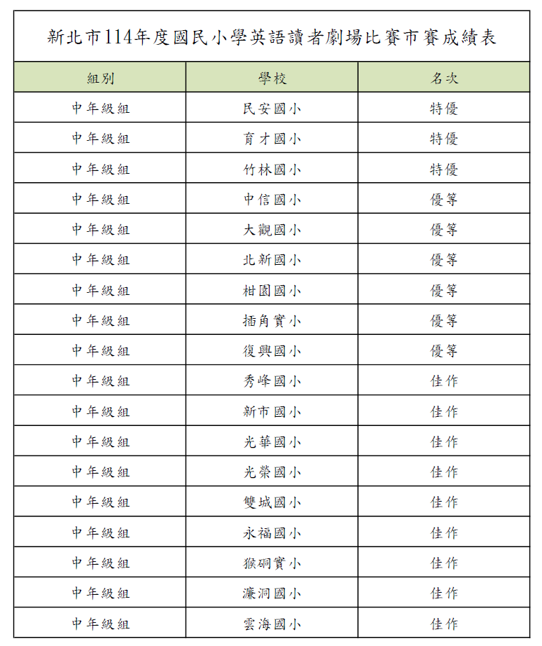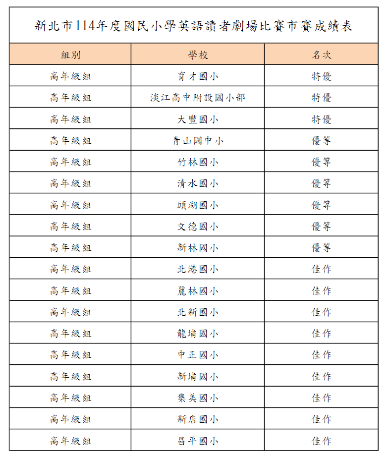 壹、114年度英語讀者劇場比賽市賽成績公告